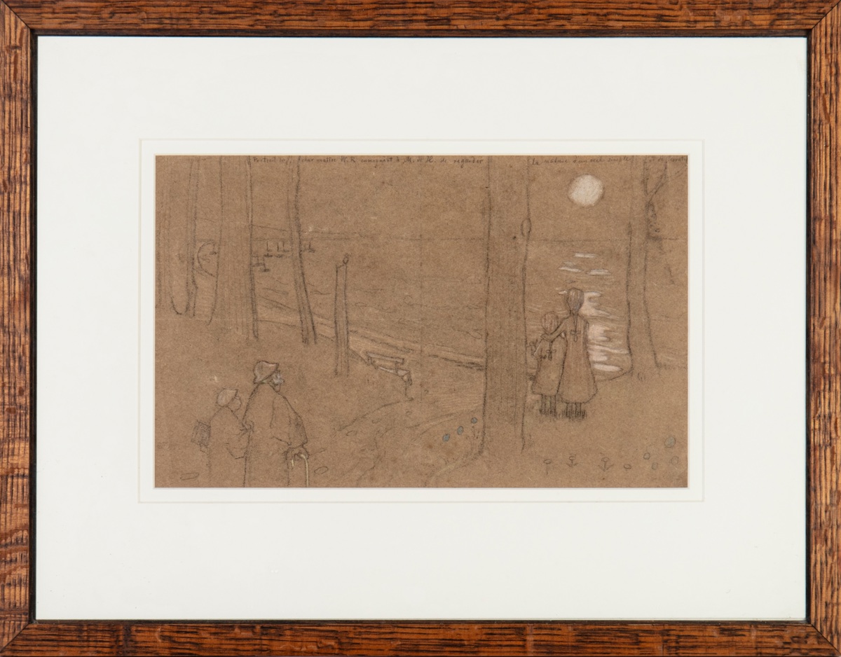 In the elegant scene on the recto, the two young girls and older couple contemplating the moonlight that reflects on the water pay homage to von Hofmann’s friend and colleague Sir William Rothenstein (1872-1945), as the inscription above states; “Portrait of dear master W.R. teaching M. de H. to look at nature with a simple and decorative eye”. Nature was at the heart of Rothenstein’s aesthetic philosophy and he preached a “return to nature" as the key inspiration for artists, rather than other artists’ works. British born but of German origin, Rothenstein met von Hofmann in Paris in 1889 while they were both studying at the Académie Julian and they remained close friends throughout their lives.