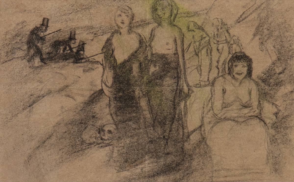 The nightmarish scene on the verso shows two semi-dressed female figures with skulls at their feet and a seated woman with a disturbing grin across her face in the foreground. In the background there are three formally dressed men, perhaps grave diggers, appearing to spy on the figures arriving in procession from the distance. The scene may well be related to the symbolist drama The Assumption of little Hannele by Gerhart Hauptmann (1862-1946) which premiered in Berlin in 1893 and was published in 1894. Hauptmann was an intimate friend of von Hofmann. The artist made at least five other drawings with episodes from the play, all bearing similarly loose black chalk lines and drawn on the very similar size and type of brown paper as our sheet.