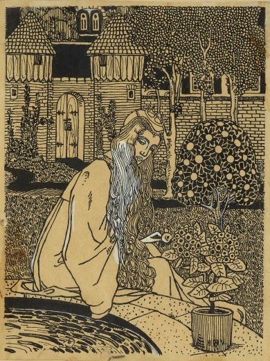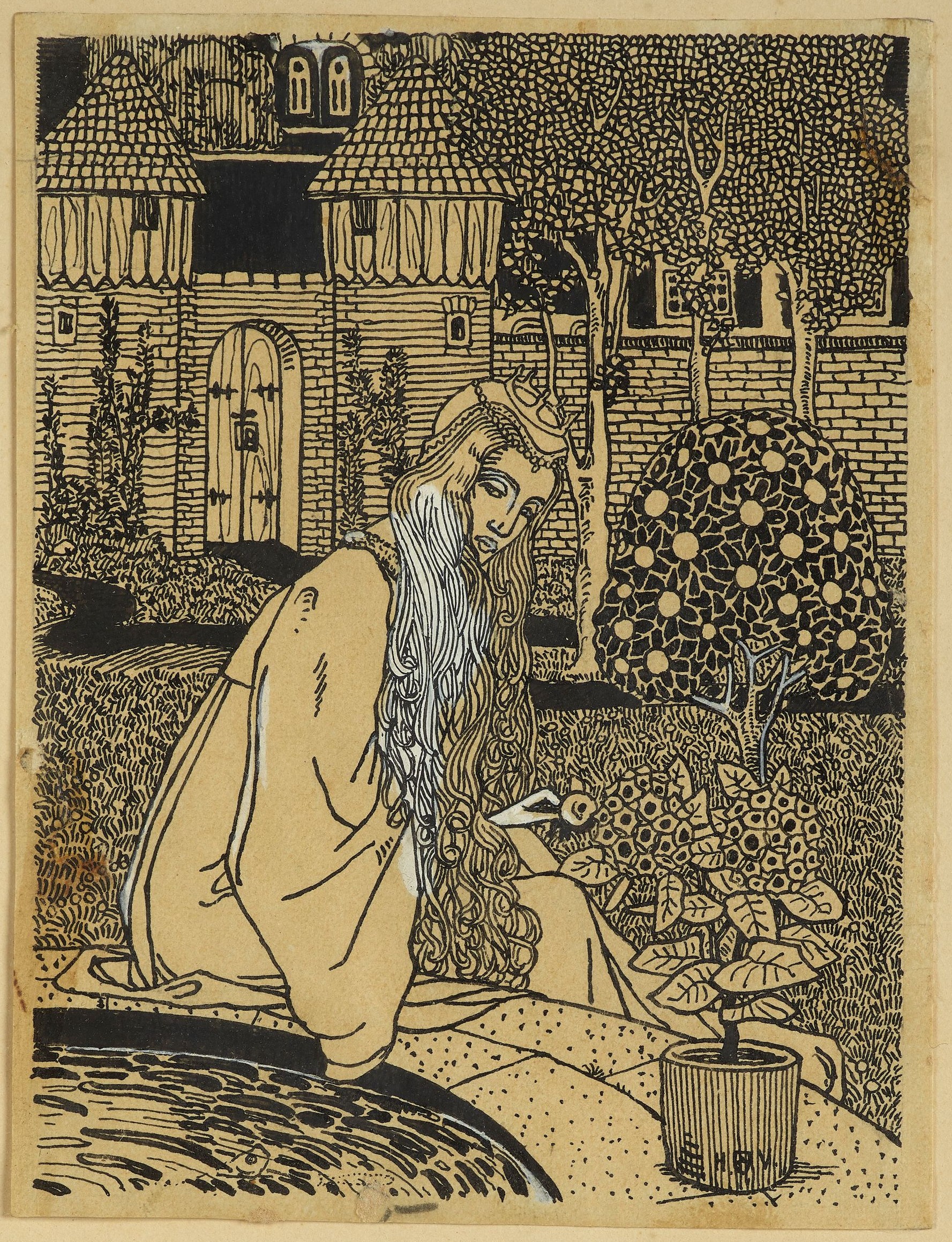 Preparatory drawing for the frontispiece of ‘Ritter Ungestüm’ by Alfred Walter Heymel, first published in 1900 by Insel Verlag publishers. Vogeler designed the frontispiece and coloured endpapers. The book is considered one of the inaugural publications for Insel Verlag (Sarkowski 728).1