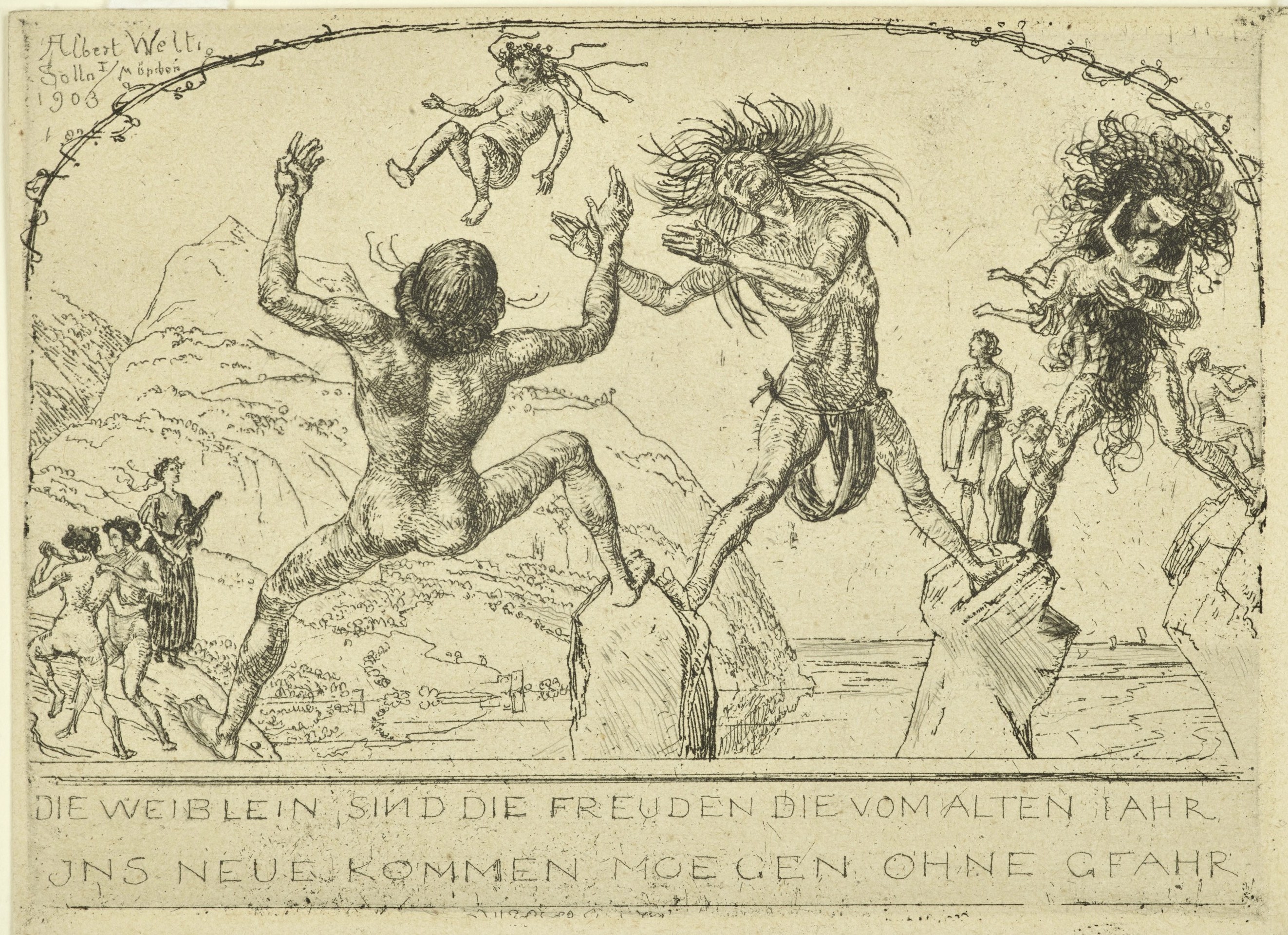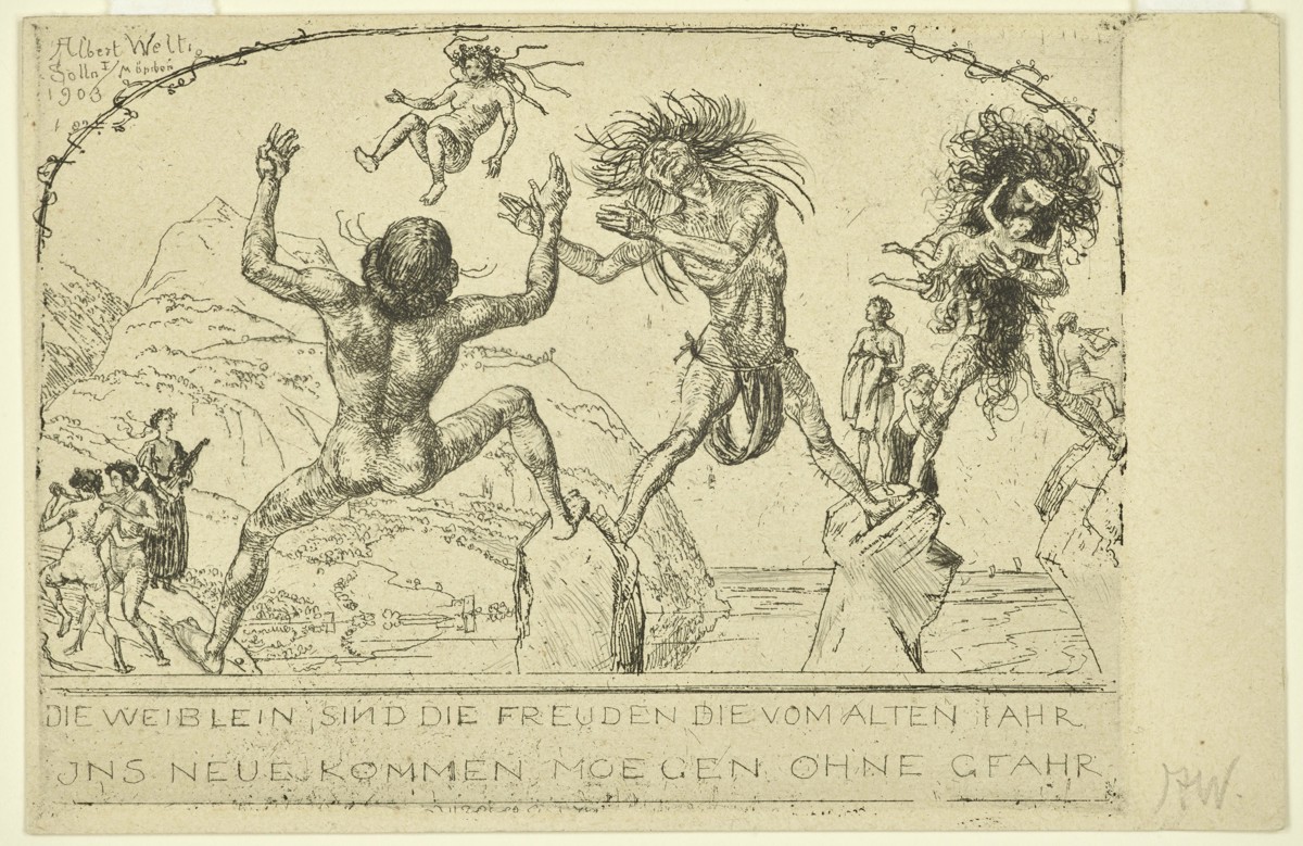 Printed in warm black with platetone as a postcard. New Year’s card inscribed: Die Weiblein sind die Freuden die vom Alten Jahr in Neue kommen mögen ohne Gefahr (Women are the joys which you can take from the old year to the new without fear of consequence).