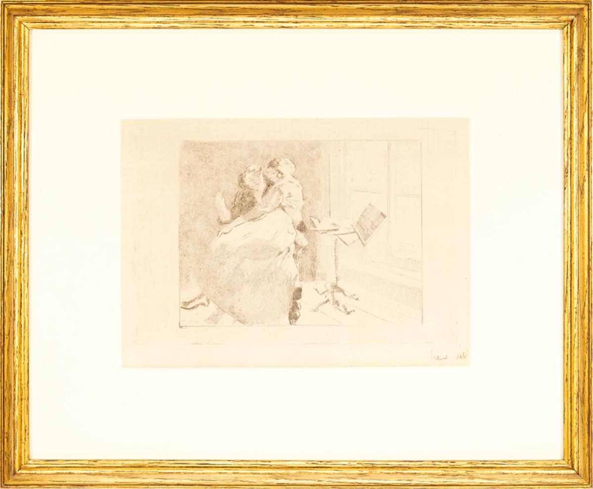 The title of this print is intentionally paradoxical, as the "Woman of letters" is busy flirting with her lover more than with her reading stand. As suggested by the inscription, Sickert was apparently not satisfied with the image. However, after the reduction of the plate, the print was published by the Carfax Gallery in 1915.