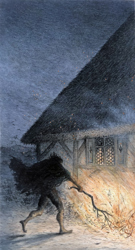 "The cottage ws quickly enveloped by the flames" - Preliminary drawing
