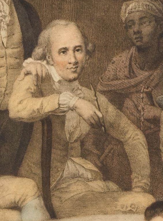 This hand-coloured etching is after the painting, now in the Tate Britain (T06856), by the German artist Johan Zoffany, who made his fortune in England and was among the founding members of the Royal Academy of Arts. The painting was commissioned by Warren Hastings, the first British Governor-General of India, during Zoffany’s sojourn in the country in the 1780s.