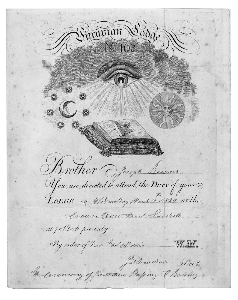 Brother Joseph Reisner You are directed to attend the Duty of your LODGE on Wednesday March 9th 1842 at the Crown (Tavern) Vine Street Lambeth at 7 o’ Clock precisely