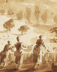 Born 1748 in Paris, J-P Chipart’s depictions of picturesque ruins are reminiscent of other French artists in Italy at the time, like Hubert Robert, Claude-Louis Châtelet, the Moreau family and Victor-Jean Nicolle. In his romantic compositions of Italian classical vistas, dramatic, cascading light permeates the idealised scenes. At the same time, his more mundane studies of trees and seascapes show an elegant stylisation, evocative in their restraint of line and description.