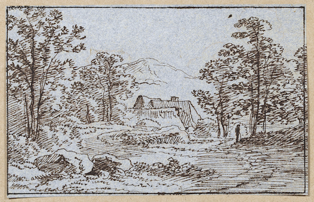 Wooded landscape with a house and a man leaning on a stick