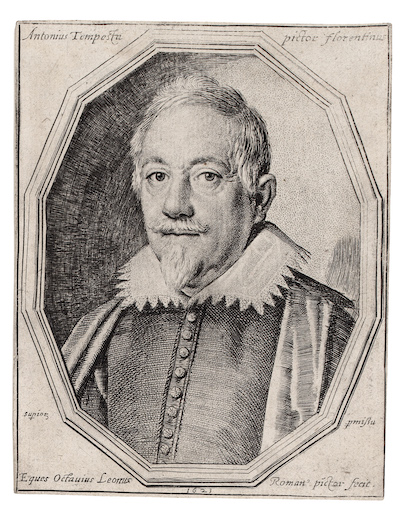 Lettered along top with “Antonius Tempesta Pictor florentinus” and below with “Esques Octavius Leonus Roman Pictor fecit 1623” and “Supior pmissu”. Backed by 17th century paper.