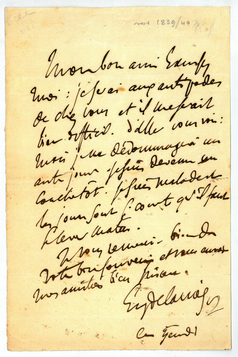 To an unnamed close friend, apologising for not being able to meet him and complaining about sleeplessness and illness: "Excusez-moi: je serai aux antipodes de chez vous et il me serait bien difficile d'aller vous voir. Mais je me dédommagera un autre jour. Je suis devenu un couche-tôt. Je suis malade et les jours sont si courts qu'il faut se lever matin [...]".