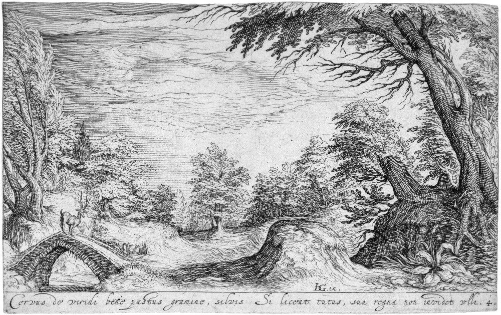 Landscape with trees and a stag on a bridge c.1610
