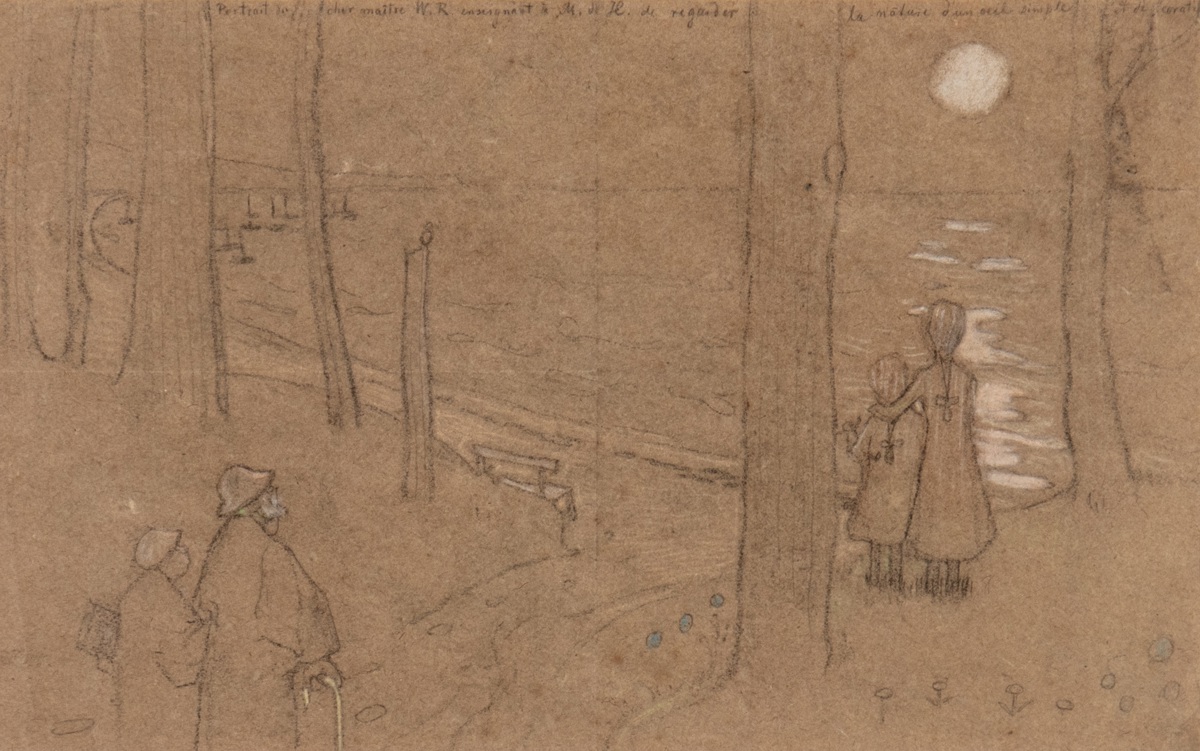 In the elegant scene on the recto, the two young girls and older couple contemplating the moonlight that reflects on the water pay homage to von Hofmann’s friend and colleague Sir William Rothenstein (1872-1945), as the inscription above states; “Portrait of dear master W.R. teaching M. de H. to look at nature with a simple and decorative eye”. Nature was at the heart of Rothenstein’s aesthetic philosophy and he preached a “return to nature" as the key inspiration for artists, rather than other artists’ works. British born but of German origin, Rothenstein met von Hofmann in Paris in 1889 while they were both studying at the Académie Julian and they remained close friends throughout their lives.