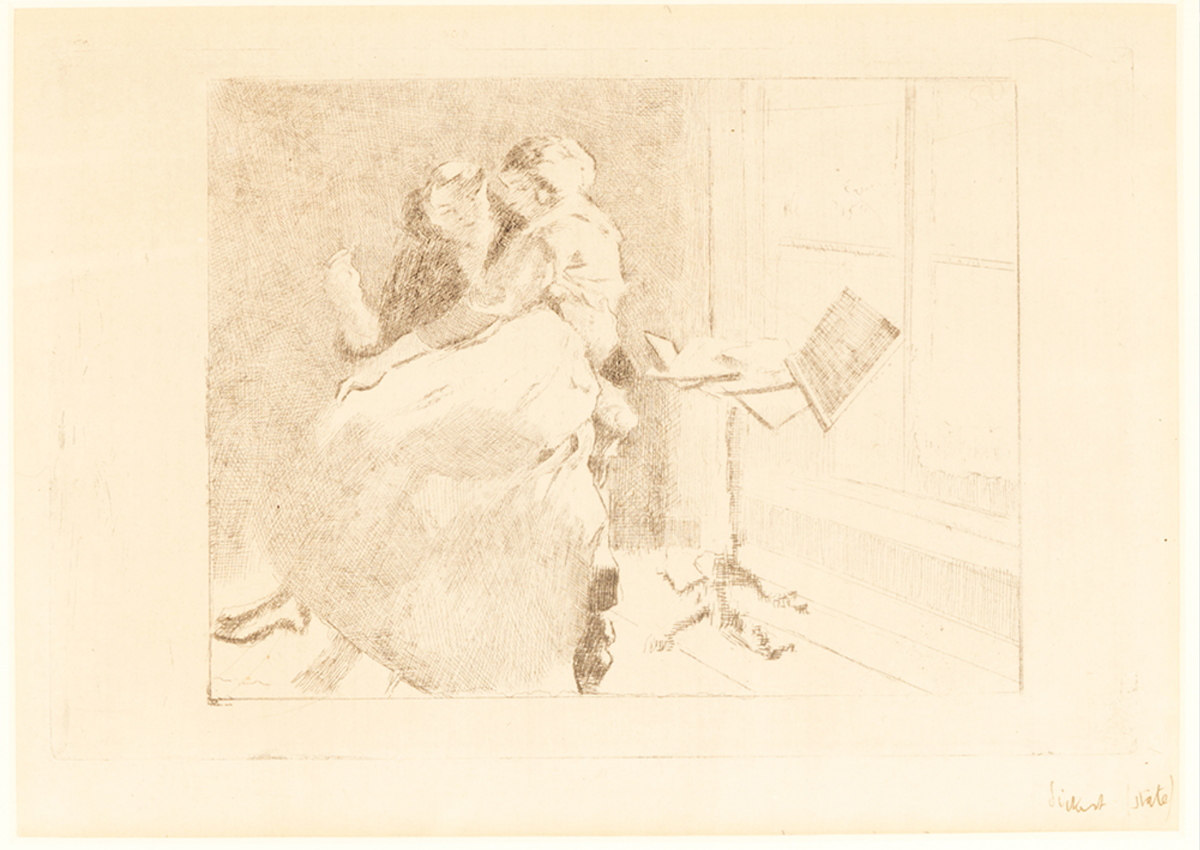 The title of this print is intentionally paradoxical, as the "Woman of letters" is busy flirting with her lover more than with her reading stand. As suggested by the inscription, Sickert was apparently not satisfied with the image. However, after the reduction of the plate, the print was published by the Carfax Gallery in 1915.