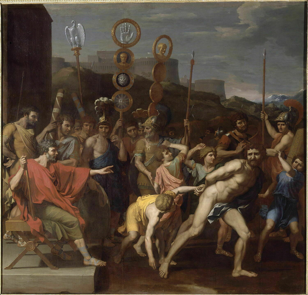 The print is after a drawing in reverse by Poussin in the British Museum (inv. 1895,0915.922) and related to a painting with the same subject now in the Louvre (inv. INV 7291). The scene illustrates an episode of Ancient Roman history; as the Roman general Marcus Furius Camillus sieged the city of Falerii, a Faliscan school teacher took his young students out of the city walls and straight into the Roman camp. He announced that he had given victory to the Romans by putting children whose fathers hold the highest authority in the city into their hands. In response, Camillus called him a villain, declaring that the Romans must not win a war using deception, but only bravery and force of arms. He ordered the teacher to be stripped and his hands tied behind his back. He gave rods to the youth so that they could scourge the traitor to the city. The citizens of Falerii gathered around this sight, and praised the justice of the Roman commander. Ambassadors were dispatched to Camillus, and then to Rome to surrender the city of Falerii. (Tito Livius , Ab Urbe Condita, book 5, chapter 27).