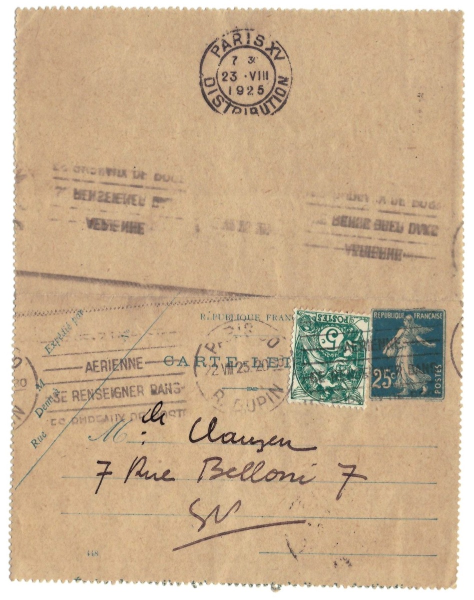 !“ […] Passerai chez vous Lundi 3h. Si je ne puis pas, certainement Mardi 11h. Mille gros Baisers.“