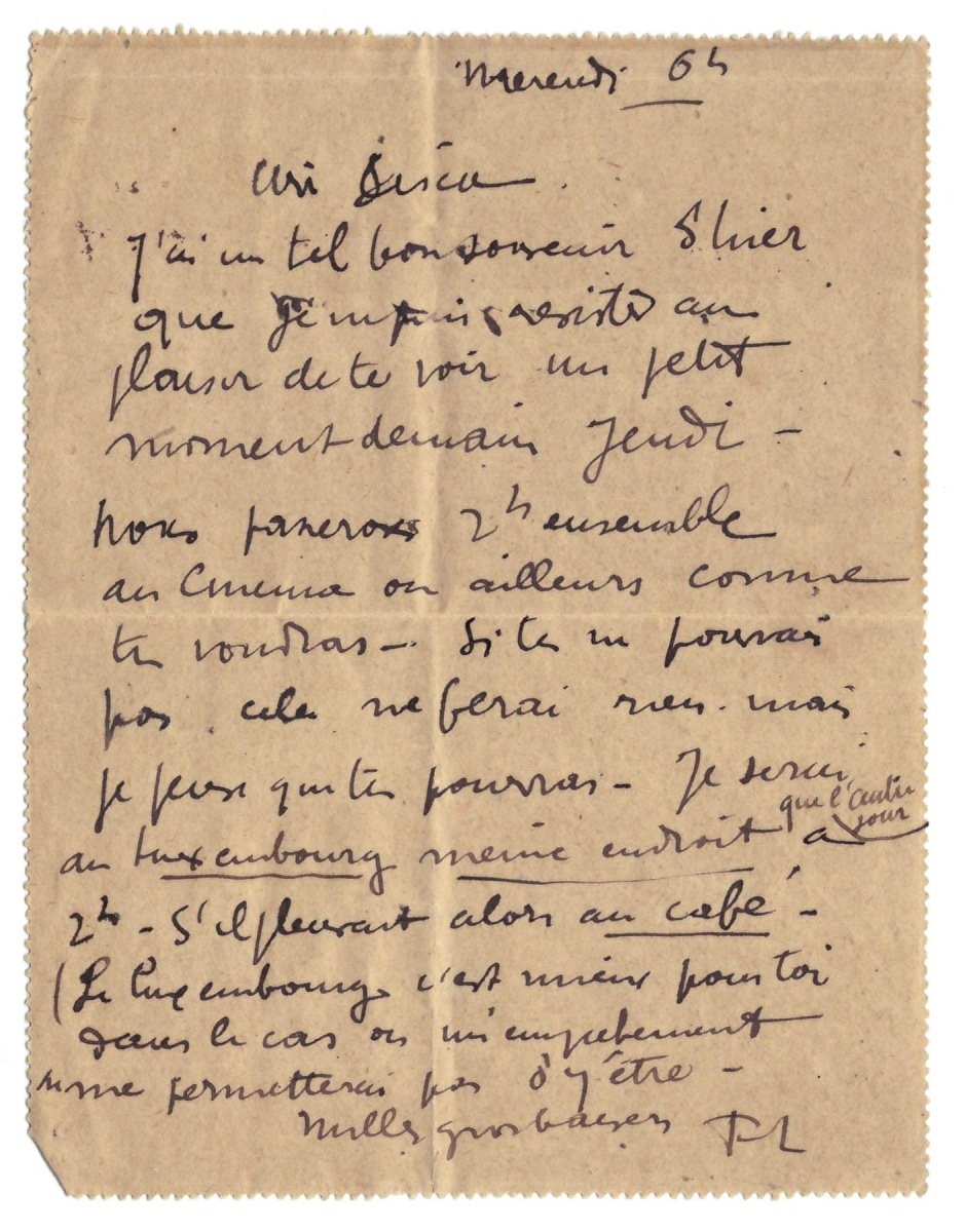 Wednesday 6 [p.m.] I remember yesterday so well that I cannot resist the delight to see you tomorrow for a short moment. We will spend 2 h together in the cinema or elsewhere as you like. If you cannot come, this does not matter. But I think that you could come. I’ll be in the Luxembourg Garden, same place. If it rains, in the café. The Luxembourg is better for you, in case I cannot be there.