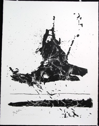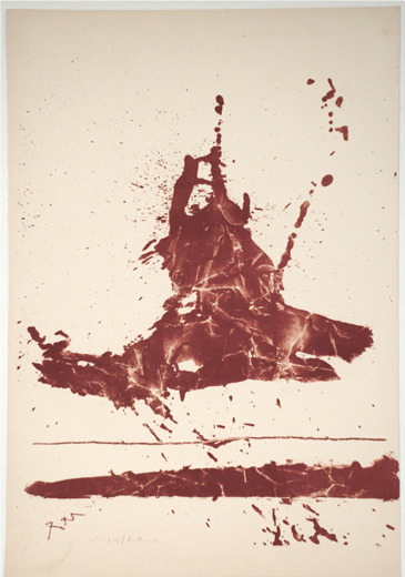 Motherwell wanted the gestural shapes in this image to be overspread by a random tracery of lines. To achieve this, transfer paper was rubbed with lithographic crayon and crumpled before being set onto a zinc plate for printing. Unfortunately, the numerous gray and white modulations originally achieved in this manner closed up after a short print run, a problem that would later be solved by applying lacquer as a stabilizer. Consequently, no edition was printed of this image. Instead, the image was printed in both black and brown, with some impressions proofed on buff Arches paper.