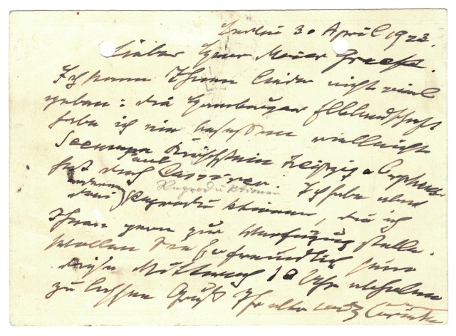 Signed and dated Berlin, 30.IV.1923. 1 page. With the receipient address verso.