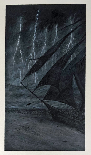 Black ink, watercolour and gouache on Fabriano Artistico handmade watercolour paper. Size of image: 17 x 9 cm. Size of sheet: 23 x 15 cm.