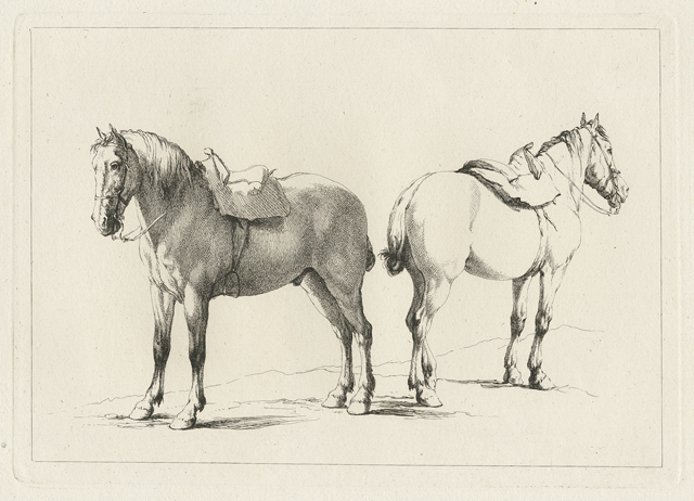 Zwei Rücken an Rücken stehende gesattelte Pferde 1802.