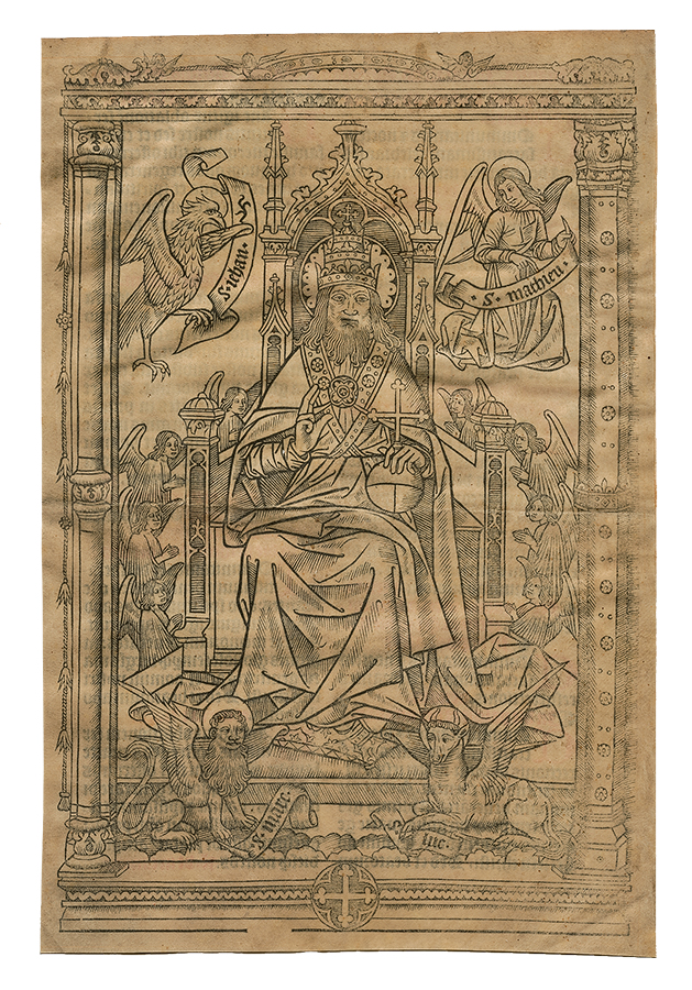 The woodcut is the major image in the book and depicts the seated figure of Godfather on his throne surrounded by angels and the symbols of the four Apostles.
